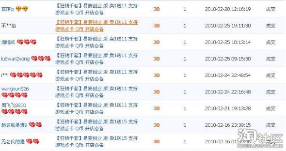 早就听说过淘宝网了,人家说现在网购80%都在淘宝网成交的~我就决定在淘宝卖,我开了店把游戏币宝贝摆上就去上学了,我也没杂想,一星期后我回家挂上旺旺就有人和我说话,说还有货没了,找你好几次了,老不在线,我可高兴啊,第一次卖东西,人家买了可多,我还送人家可多,他教我的怎么操作,后来我又卖了几次把游戏币卖完了!以后就没碰过淘宝了~