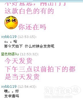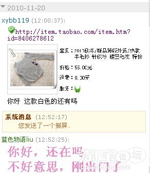 今天因为有事出去了,中午12:50回的家。打开旺旺一看有个MM发了个链接过来,问我一件镂空毛衣有没有白色的。