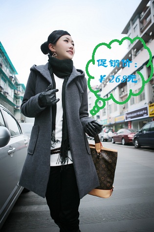 休闲时尚 布牛角扣 带帽加厚呢外套风衣
