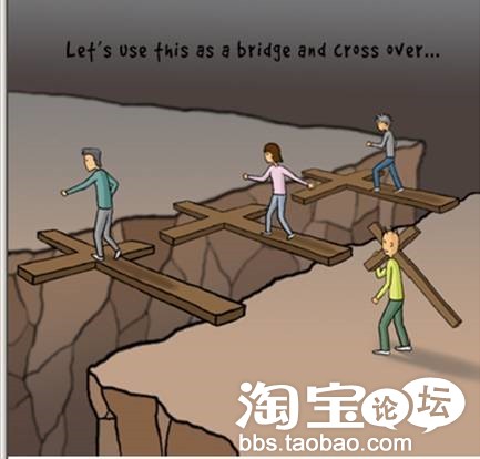 后面的人都慢慢地赶上来了,他们用自己背负的十字架搭在沟上,做成桥,从容不迫地跨越了沟壑。