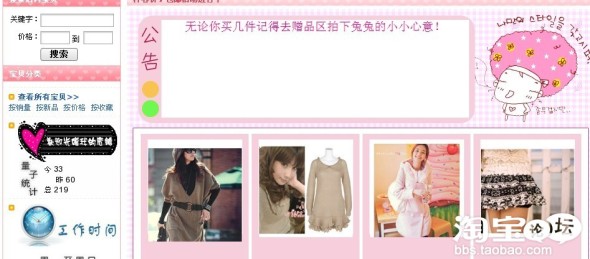 淘宝店开起来虽然蛮早的,但是对于装修一直摸不到门路,有几次真的想花点钱让装修算了,但是碍于店里的生意不怎么,本来自己就是兼职做做淘宝的,又怕花的钱不值。现在看到淘宝推出的扶持版,真的很不错啊,我第一时间就换上了扶持版,然后在淘宝大学里逛了一遍,看看牛人分享的装修方法,真的好羡慕啊。周末在家就充分学习了,现在给大家看看我的成果吧!网店地址:http://598964302.taobao.com/第一次发帖,请童鞋们多多指教!