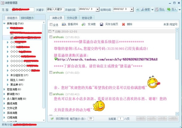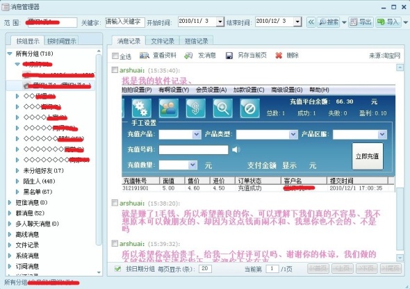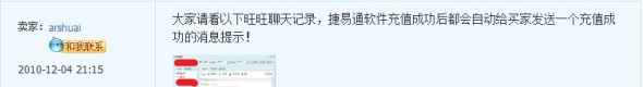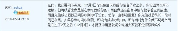 大家好!我叫小帅,淘宝ID:arshuai ,一路走来都是风平浪静的,而在12月1日这天,我正在电脑前瞎忙,突然旺旺弹出一个卖出宝贝的消息,嘿嘿,心里不由地兴奋起来,嘿嘿~我于是进入我已卖出的宝贝里,点了买家旺旺,打算和买家聊了起来。但是一看他的淘宝资料,咦~这个人的名字怎么取的这么随便,而且还没实名认证,根据个人历来的经验,此时在心里头油然生起了一丝的顾虑,他不会是骗子吧?额、可能是我多虑了吧、怎么可以这样怀疑我的顾客呢,嘿嘿,所以就自己主动的去和他聊天了,但是我说了老半天,却不见他回应,心中的忧虑又添加了一分,但我又在想:可能是人家太忙了没空和我瞎掰吧,那好吧,就不打扰他了,反正充值都成功了。12月3日,打开电脑,上了旺旺,一条旺旺弹出的消息把我吓住了---”买家XXX申请退款“,天呀,担心的事情真的发生了,看来我的顾虑是对的!我都充值成功了、他到这个时候才申请退款,肯定是骗子,对于骗子当然不能心慈手软啊!第一反应就是:拒绝申请退款!于是乎,有了下面的争议: