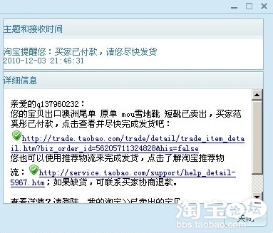 2010.12.03晚上6点多的时候。。听见叮咚的旺旺声音。。买家问这款鞋子的有没有37的。。我说有,,然后他就下线了。。我还纳闷既然有货为什么还不拍呢,,可能考虑到我没有信誉吧,,,但是晚上8点多的时候,买家又来找我。。说他回去上课去了刚下课。。买家可能也是第一次在淘宝购物。。教了他怎么拍怎么付款.、、、、付完款已经快10点了、、成了一单还真不容易哈,,,