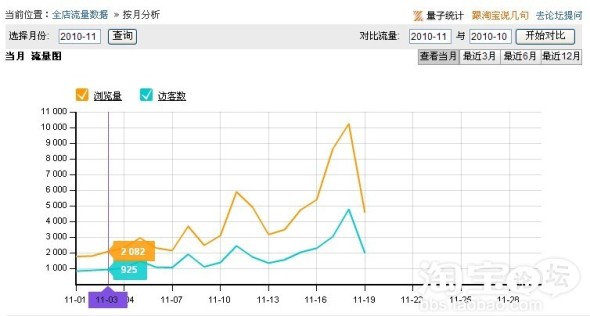 什么?一月三钻?天方夜谭吧!先不用多说废话!直接上图佐证: 我们商城正式大量产生交易从10月15日开始,15日以前,流量很低,每天也就几百PV,最低时200,IP只有80,最高时只有一次超过600,IP也只有200多,只产生了零星的几笔交易,要知道,我们是商城,每天的开销不少,零星的几笔交易根本是入不敷出。当时80%的产品已经上了线,一直是满怀期待订单如雪片一样飞来啊。可是,偌大一个商城,犹如一片死水,任凭我们内心有着无限的激情也掀不起半点波澜。但是,我们既然来到淘宝进行二次创业,我们就绝不退缩,我们一定要找到突出重围的办法!!最终我们找到了! 从流量图来看,我们商城的流量一直在飙升: