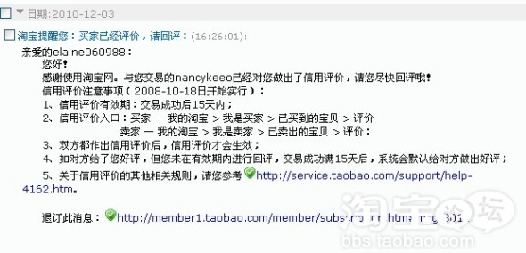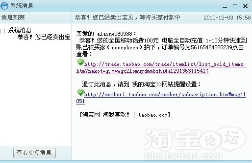 功夫不负有心人,嘻嘻 我收到了系统消息,刚开始接到看消息,那个高兴呀,真不知道怎么说才好,但买家说,你的怎么拍了付不了款呀,我想,我怎么可能呢,马上咨询朋友,嘻嘻 原来我是个“黄昏鬼” (方言)我没有把充值的软件登上去。连忙对买家说对不起,让他不要急,并告诉他我是新手,如果可以麻烦他等一下,没想到,他还安慰说,不急,慢慢来,刚开始是这样的 ,在此对我的第一个买家“ nancykeeo" 说声感谢。等到她付款后,我这边还冲值不成功。