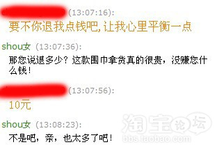 她说要退钱给她,这款围巾37元卖给她的,说实话,这款围巾拿货确实很贵,只是为了做熟客,赚点人气,价钱定得很低的,而且当时我还赠送了一条项链给她!她现在要求退10元给她,那我还得亏本钱了!