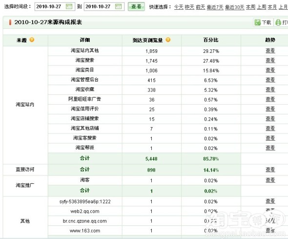 3;借助数据分析软件,由于本人具有良好的财务工作基础,喜好研究各类数据的变化。先后使用过外国的数据软件,小艾分析,店铺旺娃娃,网店版,淘宝助理,到最后使用了量子统计等多种数据分析软件,每天坚持观察至今店铺的人气流量和来源变化,观察自己所应用方法的效果。