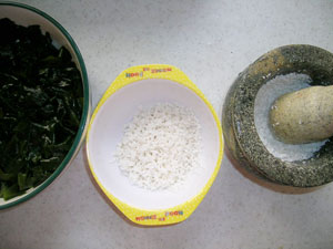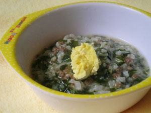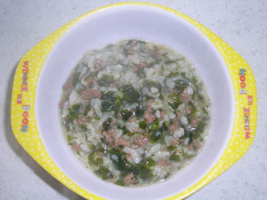 材料:裙带菜30克 大米50克 牛肉50克 盐 酱油