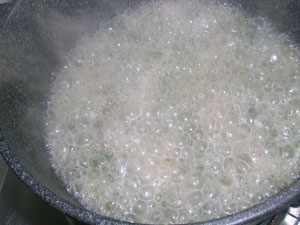 开锅后用大火煮5分钟,再改中小火煮15分钟,中间得多搅几次免得糊锅。最后放盐和鸡精调味。好了大功告成了。。