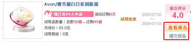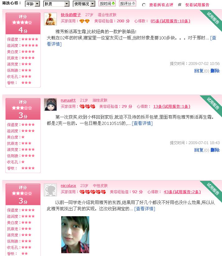 化妆品免费试用首页http://try.taobao.com/可查看报告和提交报告。用户提交的试用报告可在淘宝美容点评库产品点评详细页查看。如下图:点仅看试用报告选项。