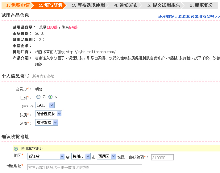 1.到论坛看每日最新试用→2.写心得→3.跟帖回复粘帖你的心得地址或图片→4.等待公布申请成功的名单→5.如申请成功旺***告知地址→6.等待发货→7.到货后在论坛开新帖提交试用报告。