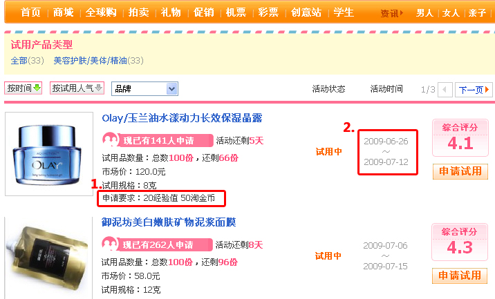 新的美容试用平台,用户在申请化妆品免费试用时需要拥有一定量的淘金币及美容经验值。