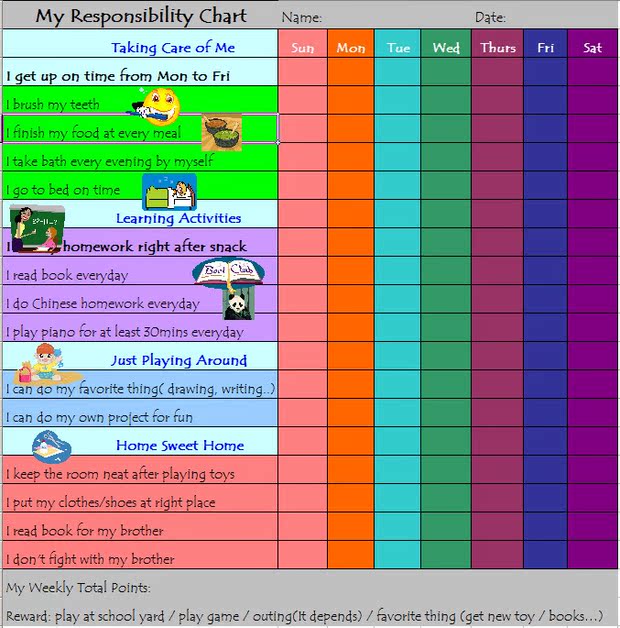 现在女儿的表现很好,我每星期给她打印出来,贴在她的写字桌旁边,让她完成一件事情,就勾一个. 有一次我妈妈看她还吃剩几口饭,想喂她,她马上说妈妈要说的,因为我有一项要求,要她自己吃饭,外婆喂的不算.哈哈, 我心里暗自偷笑呢.